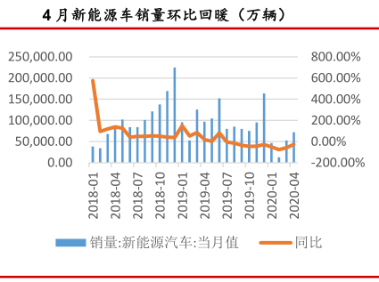全年累计产销量同比继续下降但降幅收窄。从累计数据上来看,前4月累计月销量同比仍呈现负增长,但降幅显著收窄,2020年1-4月,新能源汽车累计实现的产销量均为20.5万辆,同比下降分别为44.8%和43.1%,相较于2019年的全年数据仍维持负增长态势,较降幅较之前已显著收窄。