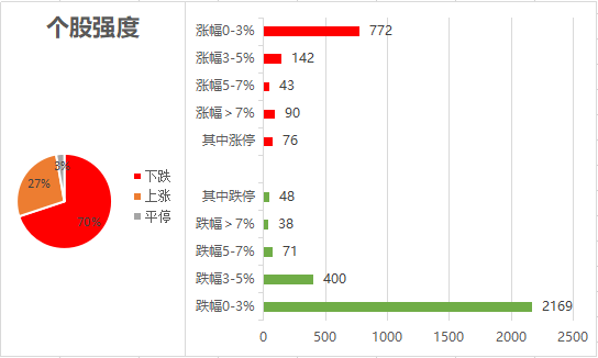 个股强度方面,上涨占比27%,下跌占比70%,平停占比3%。
