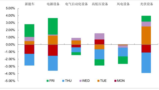 上周,电气设备板块报收5227.81,下跌-0.73%。子版块方面,新能源车版块下跌-0.08%;电源设备版块上涨 0.02%,涨幅最大;自动化版块下跌-0.5%;高低压版块下跌-1.33%;风电版块下跌-2.6%,跌幅最大;光伏版块下跌-0.02%。